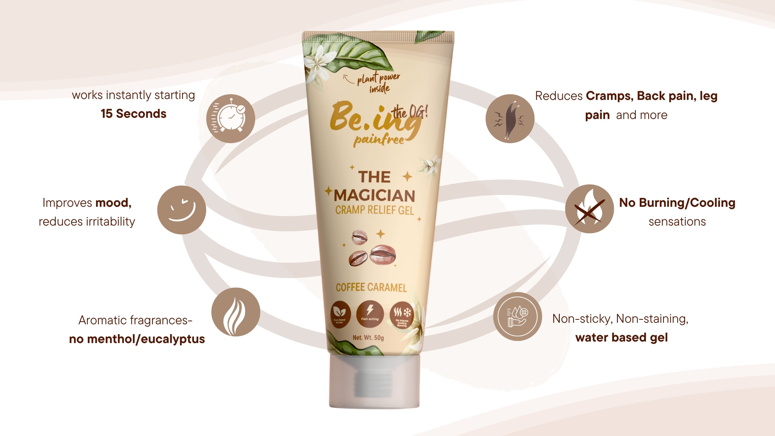 - cramp relief gel: for instant relief starting 15 seconds from cramps (rhythmic pattern pain)