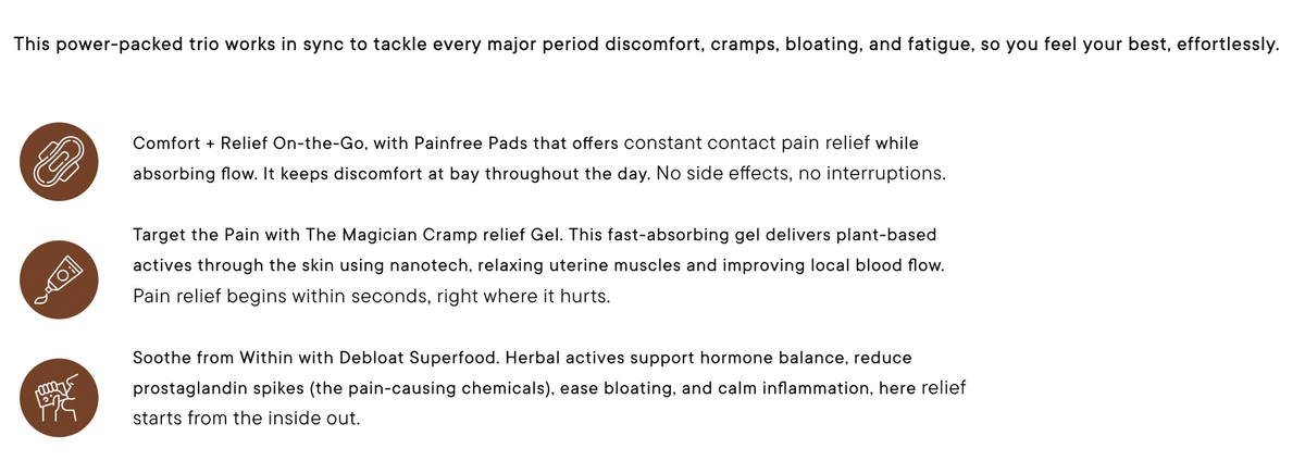 • For Medium Cramps: Painfree pads + gel for fast relief. For Persistent stomach pain with heaviness and bloating: Painfree pads + Pain-free superfood. For complete comfort: Go for the combo pack!