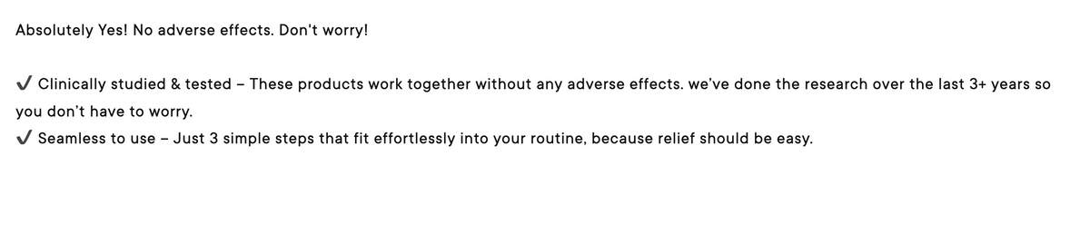 • No any adverse effects. Unlike painkillers or hormonal treatments, our products work naturally with your bodyβ€”no drowsiness, no irritation, no dependency. All the products have undergone a rigorous safety profiling with pre-clinical trials and clinical pilot over the last 2+ years. They absolutely have no interactions with anything and are completely safe. This is even endorsed by the leading gynecologists from hospitals like Narayana Health, Manipal, AIIMS and likewise.
