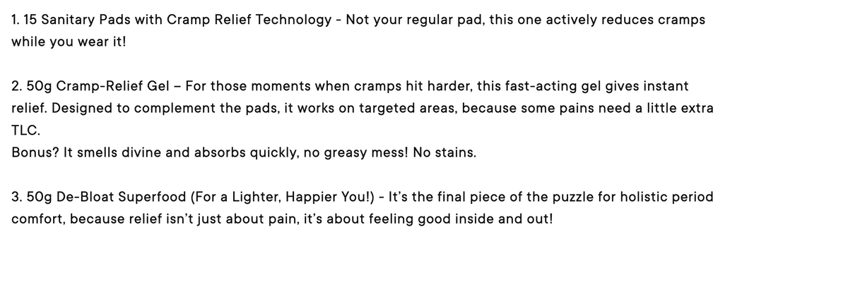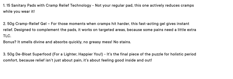 This combo brings together Sanitary pads with Cramp relief technology, The Magician- Cramp Relief Gel, and De-Bloat superfood to give you a 360Β° comfort during periods.